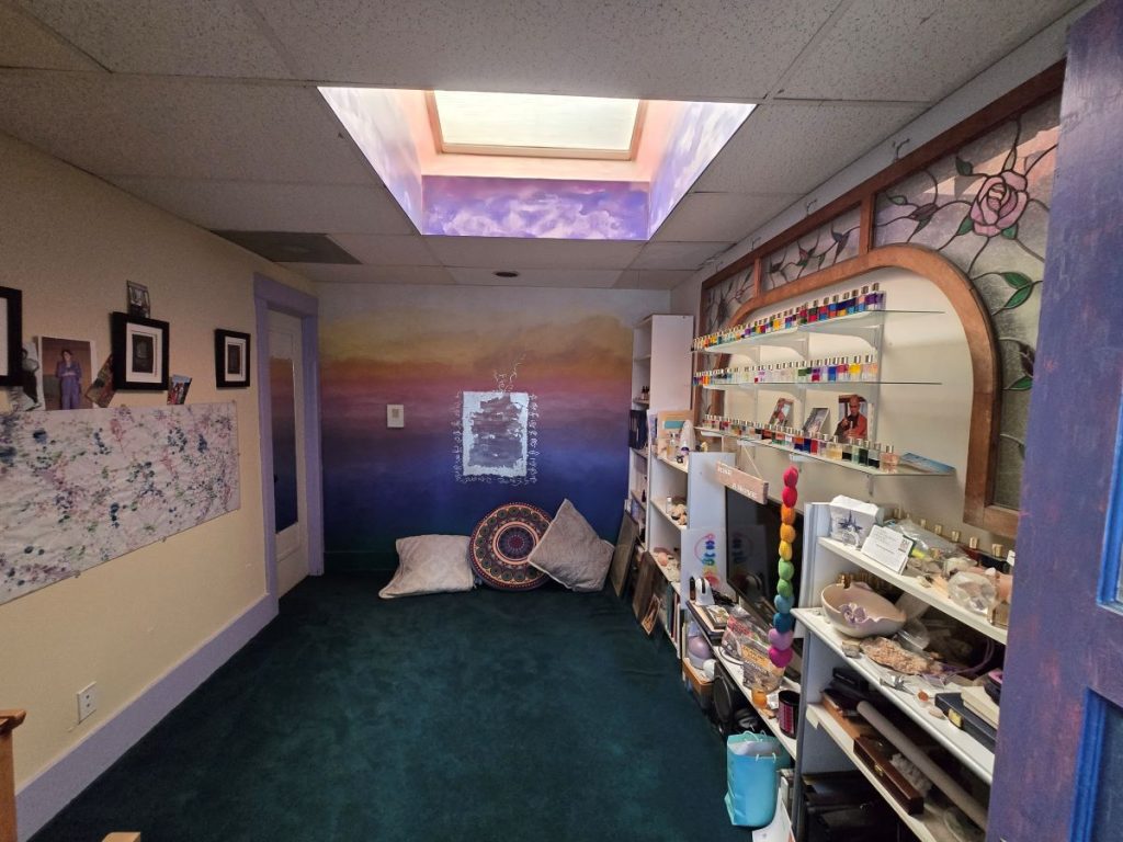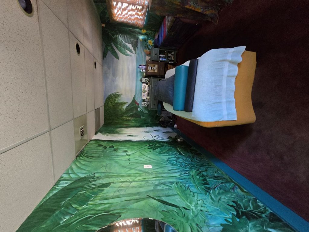 In the back of the house you find a room that is reminiscent of the North Shore of Kauai. The hand painted Heiau along with the red dirt carpet and the bamboo shades allow you to relax fully into your treatment. If you are lucky enough during your session, the crystal bowls will sing for you.