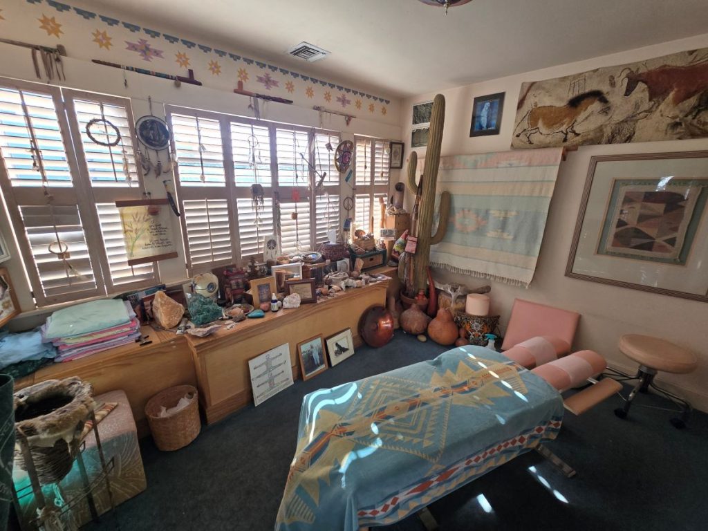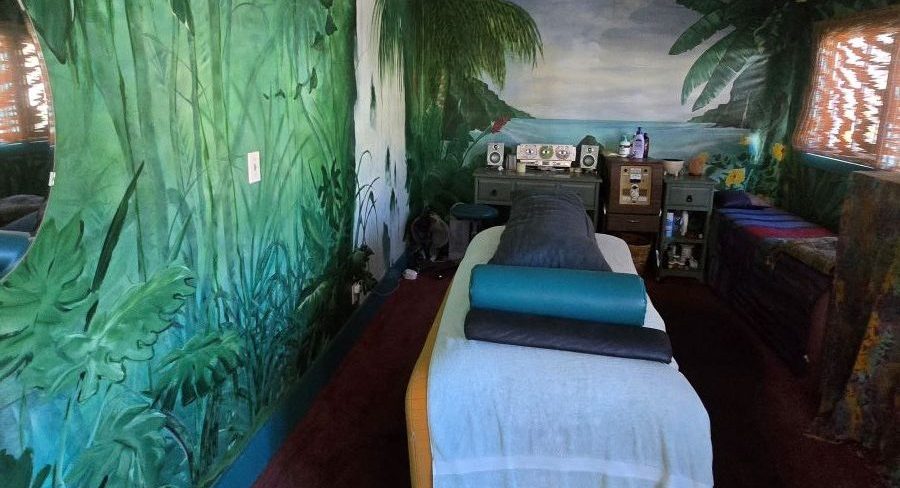 In the back of the house you find a room that is reminiscent of the North Shore of Kauai. The hand painted Heiau along with the red dirt carpet and the bamboo shades allow you to relax fully into your treatment. If you are lucky enough during your session, the crystal bowls will sing for you.